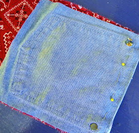 Next we are going to make a pot holder sandwich. On the table top you lay one piece of denim insulation, with one piece of cotton batting on top of it, then another piece of denim, topped by the contrast/pocket piece with the contrast fabric facing down. Pin a few spots to hold together.