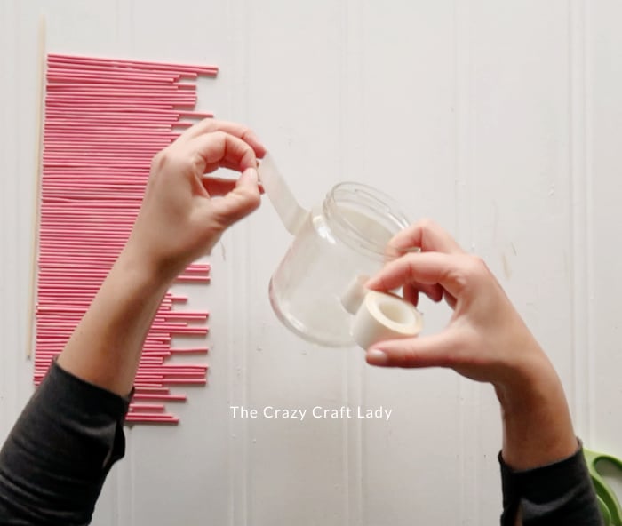Attach the sticks to the jar. Put a piece of heavy duty double-sided tape around the lower part and the upper parts of the jar. Begin pressing the sticks onto the tape, ensuring your first stick and straight as it will guide the rest of them.
