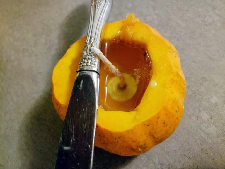 Let the wax cool for a minute or so before you pour it into the pumpkin. That wax gets really hot, really fast, so be careful with this step.