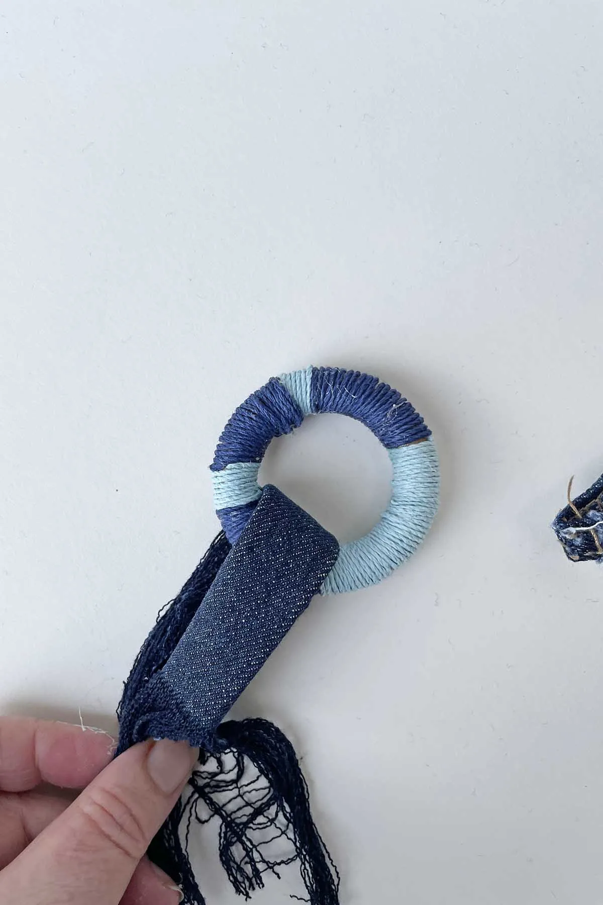 - Denim seam from the inside leg of a pair of jeans, long enough to wrap around the wooden ring. Or you can use some nice coloured hemp cord.
