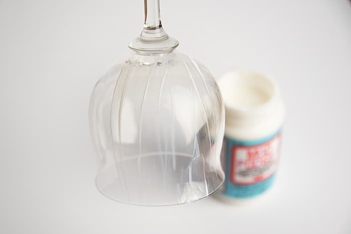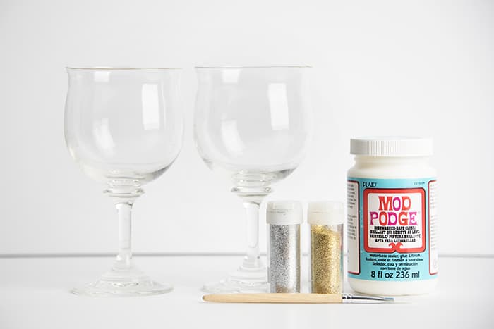 Brush each glass with an even coat of Mod Podge Dishwasher Safe. Optional: use painter’s tape to block off any areas where you don’t want glitter.