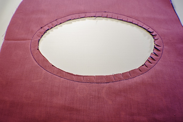 Place one outer piece and one lining piece right sides together and pin. Measure down 2″ from the bottom of the hanger and draw a circle or oval. Stitch around the oval through both layers. Cut a hole about 1/2″ inside the oval. Clip around the curves. Push the fabric through the hole so that the fabrics are right sides out and press. Top stitch around the oval.