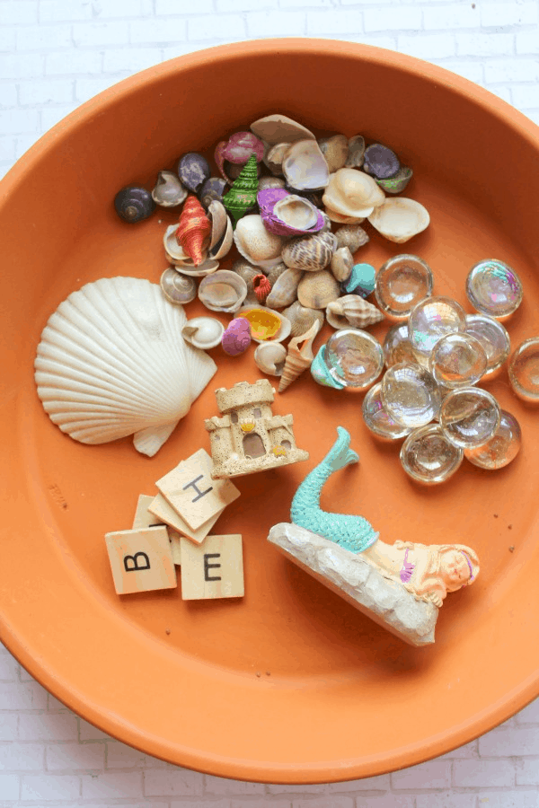 Alright now let’s get swimming! Now things really get easy because it is just a matter of assembling your mermaid fairy garden craft. I prefer not to glue anything into place, that way the kids can play with this as they wish and move things around which they will.