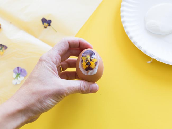 You can make these with brown hardboiled eggs like I did. Or you can use white eggs and dye them before adding flowers if you like. You can even use craft eggs like wood or paper mache to make beautiful eggs that you can keep forever!