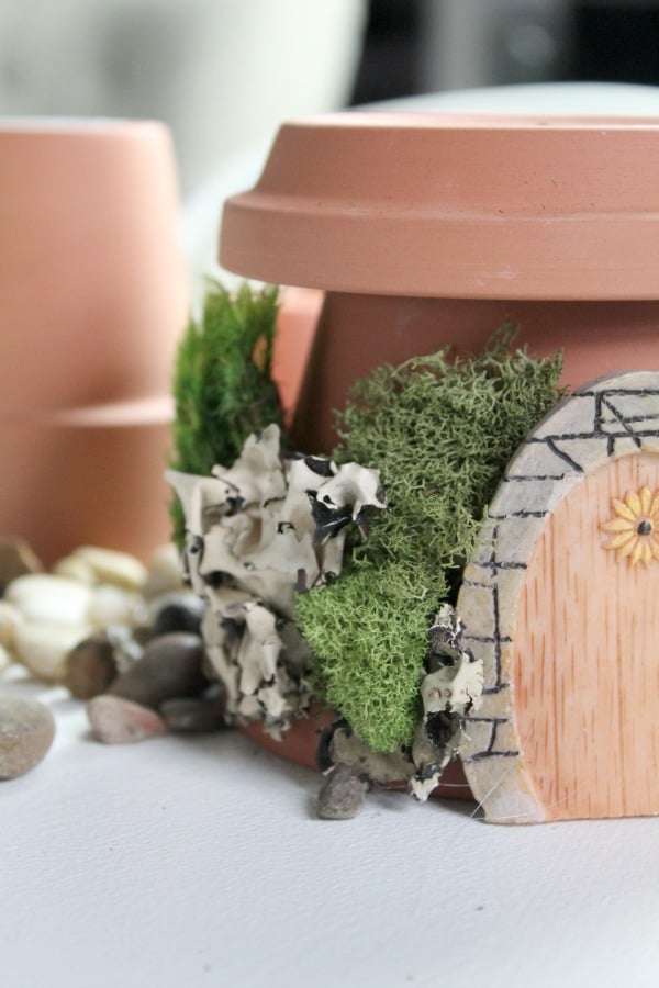 6. Start by building the moss up around the door and continue to work your way around the rest of the pot. Just add some glue, press, and hold the moss in place until secure.