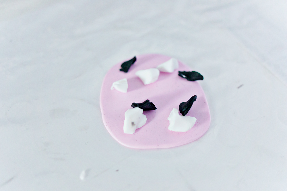 – Take small pieces of clay from the other two colors and randomly place them on top of the rolled out clay.
