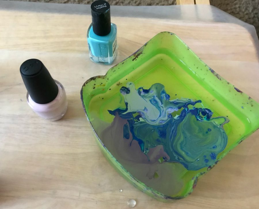 This makes a skin on the top of the water that will float and dry very quickly. You can use a toothpick to blend or manipulate your polish if you want. The original pin that inspired this has specific designs in it that she made, but I couldn’t perfect the technique, so I went with a more organic design.