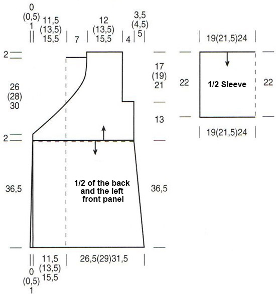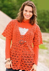 Assembly: Perform shoulder seams. Edge the fronts and neckline with 1 row of single crochet. Set in the sleeves, adjusting the top edge of the sleeves to the height of the armholes. Perform the side seams and the sleeve seams.