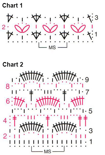 Main pattern: The number of stitches to cast on is a multiple of 6 + 1 + 3 chain stitches for the turning chain. Work according to Chart 1. Each row starts with 3 or 1 chain stitch as the turning chain instead of the first double crochet or single crochet and start from the stitches before the repeat, repeat the pattern, and end with the stitches after the repeat. Work once from the 1st to the 3rd row, then repeat the 2nd and 3rd rows. Work the single crochet of the 3rd row into the chain space of the previous row. In the instructions, the starting and ending stitches are calculated per 1 repeat.