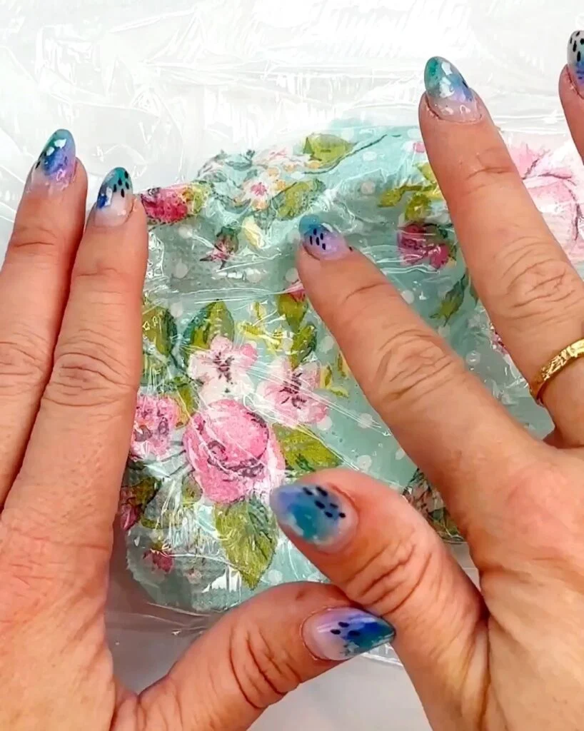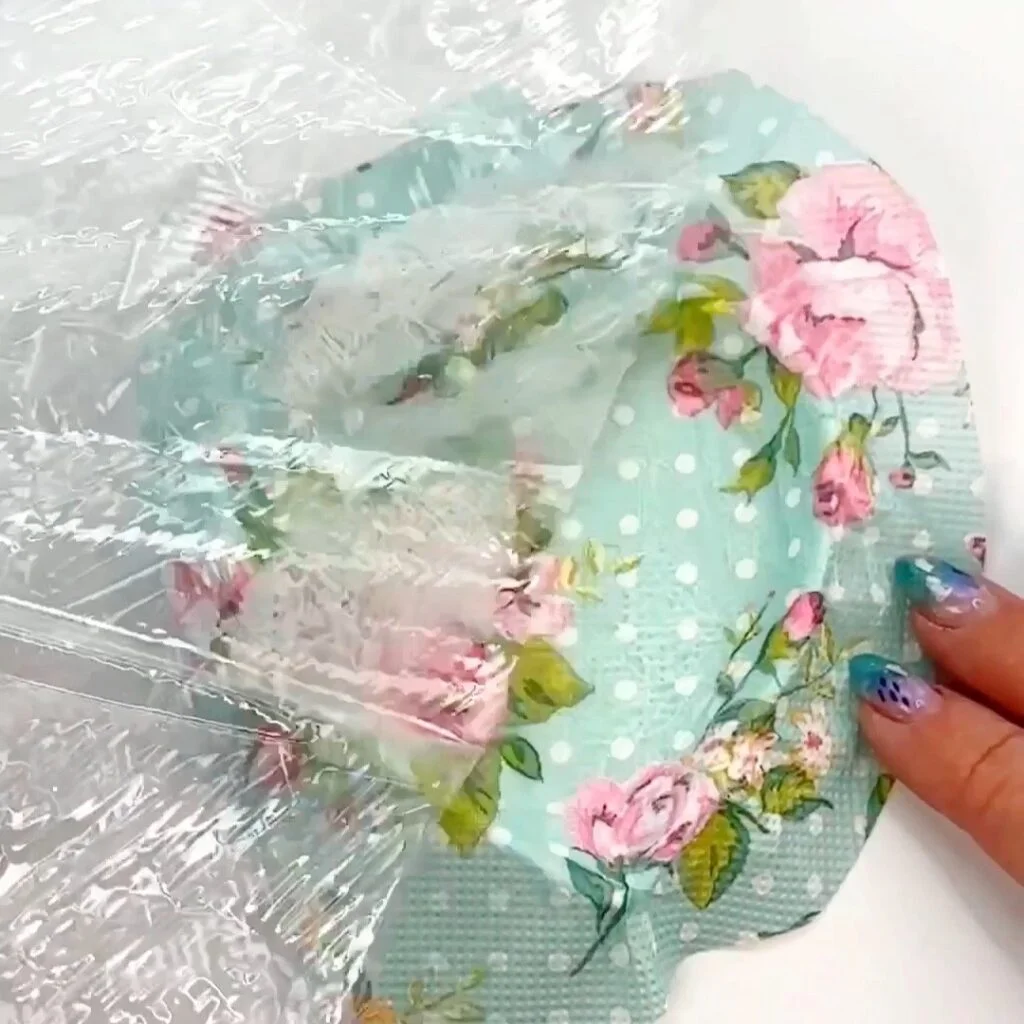 Step 5. Pick up the Saran Wrap and turn it over and place it directly onto the item you are decoupaging onto. With the Saran Wrap in place, smooth out the wrinkles and air bubbles, pressing down with your fingers.