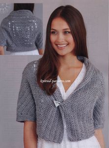 Note Designer recommends trying on Shrug before sewing on button, to determine appropriate placement. Weave in ends. Sew button to right front edge, opposite button loop.