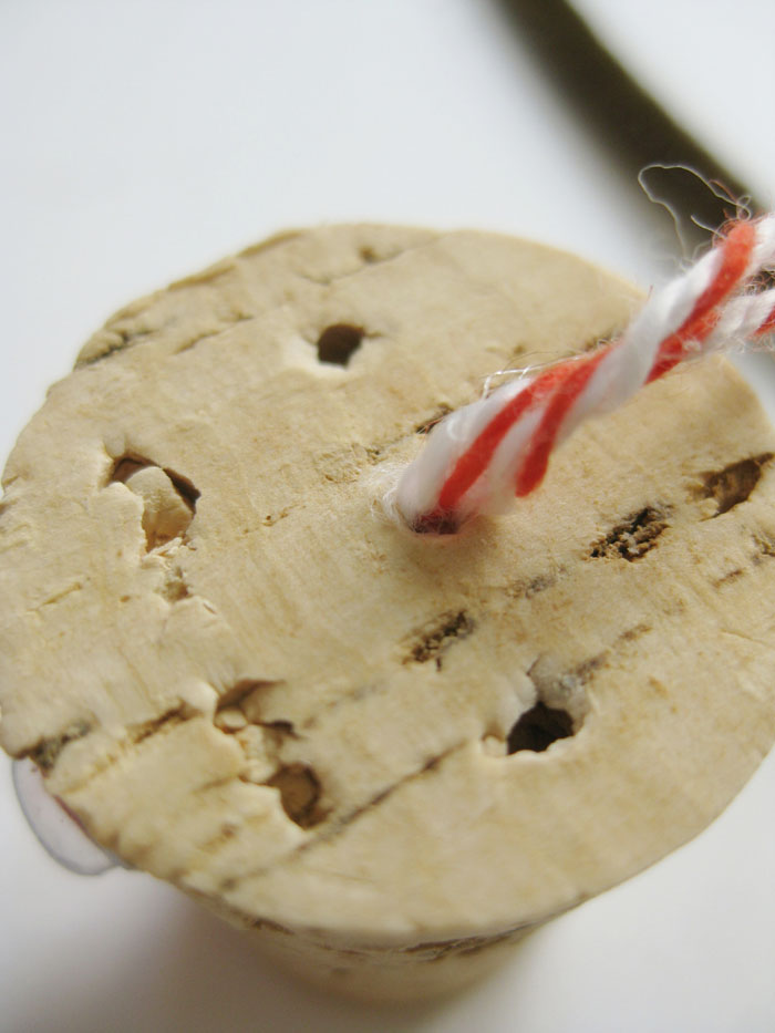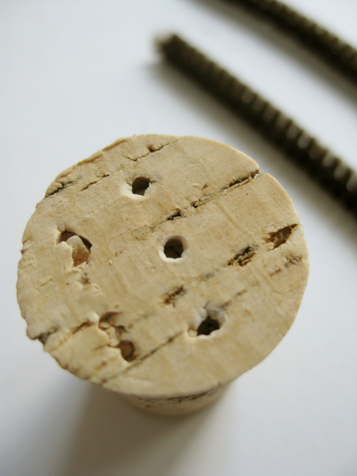 Using an awl tool or a stick, punch three holes in the top of the cork, as seen in the picture below.