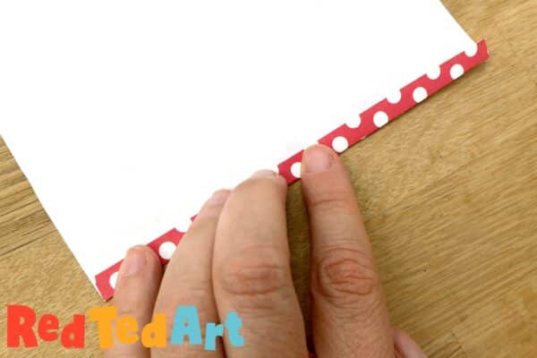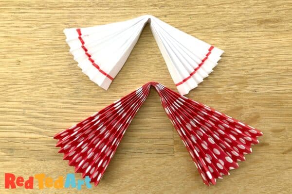 Concertina fold your square piece of paper with approximately 0.5mm folds. I added some red strips to the white paper for effect – but you can leave them plain too! Fold the wide paper in concertina shape along the 10cm edge.