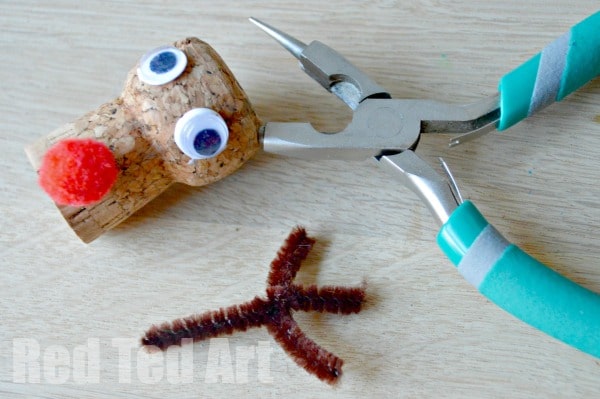 4) Then cut a little craft wire and, as per the reindeer antler, insert it into the top of your cork for hanging. Let your reindeer ornament dry fully before hanging.