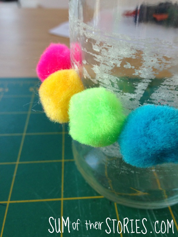 Now just hot glue the pom poms onto the jar. It's easiest to apply a 3 cm or so length of glue then press on 3 pom poms. Then just repeat. You want them pretty close together so there are no big gaps.