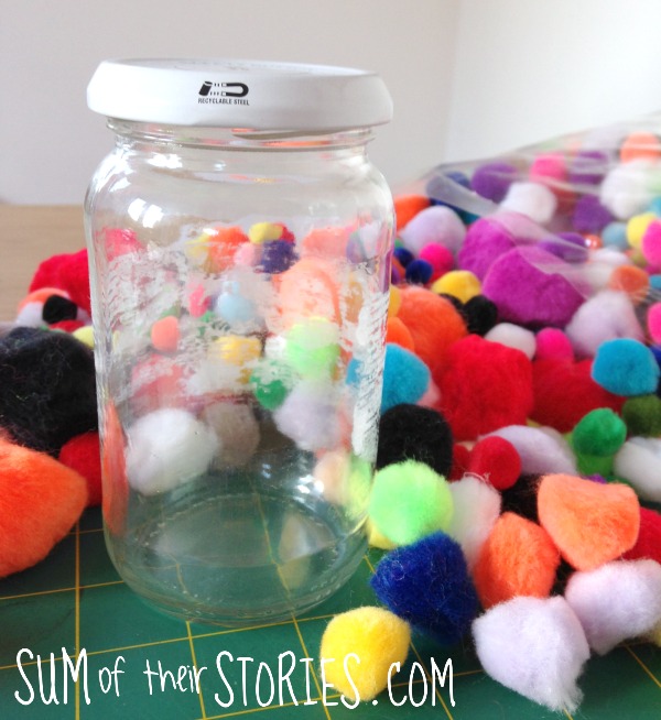 I only used the bright coloured pom poms for this, I didn't include black or white or the soft pink or yellow. You can use whatever colours you like but it is definitely worth getting them all ready in a bowl. Once you start gluing you want them easy to grab.