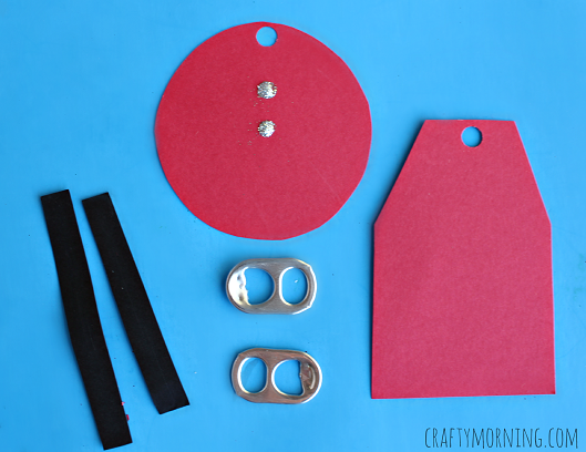 Cut out a rectangle and circle with the red card stock paper. Punch a hole at the top and put a black strip of paper through the soda can tabs.