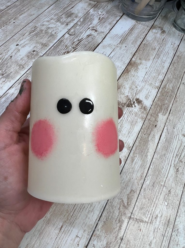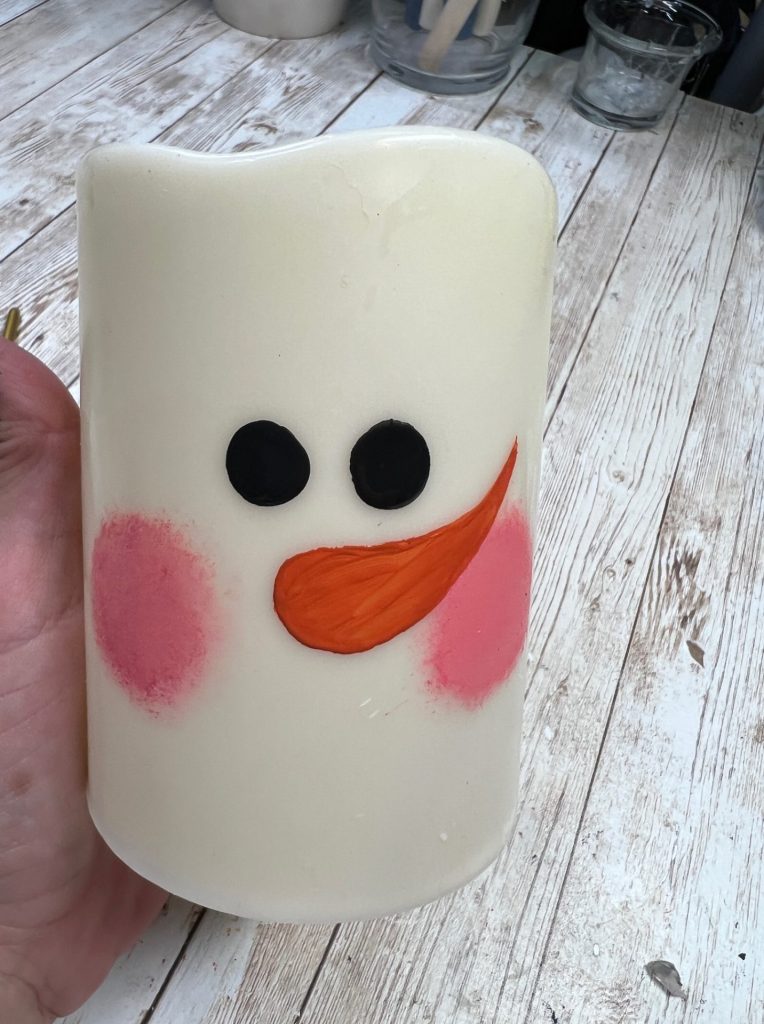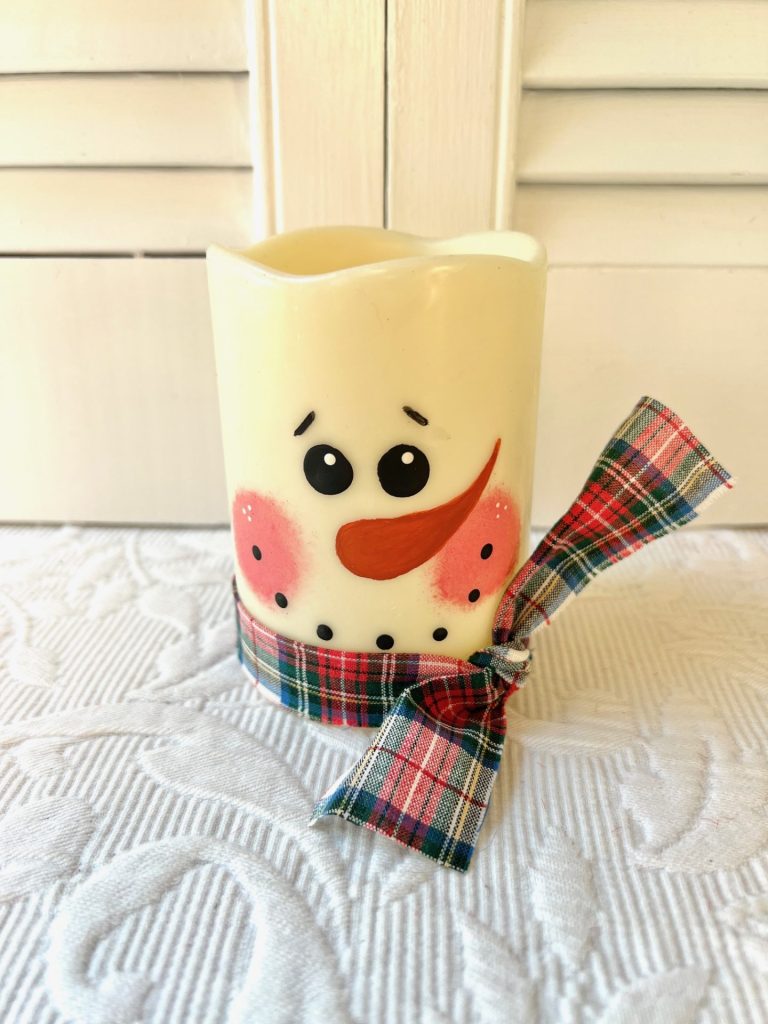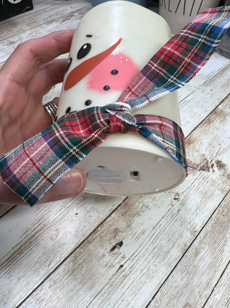 Finally, I took the fabric strip and tied it around the base of the candle, making the snowman scarf.
