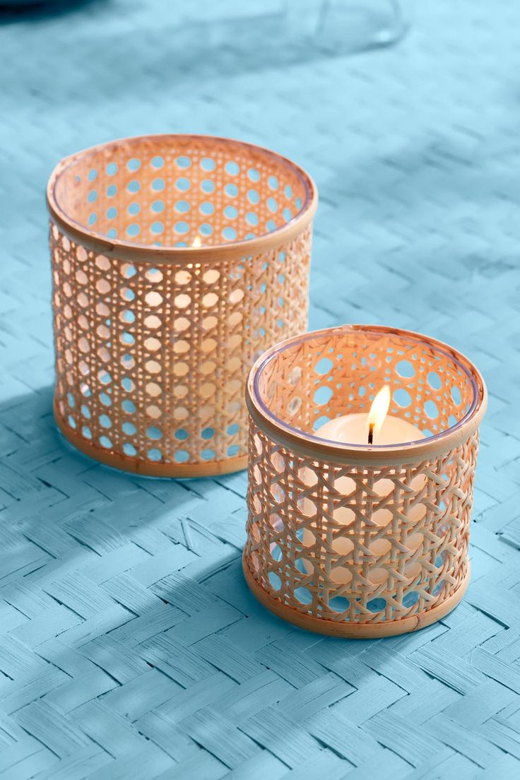 To make: Measure the height and circumference of a glass votive holder. Cut caning to fit around the holder. Spray the back with adhesive spray, such as Super 77; attach to the glass. Cut pieces of flat reed the diameter of the holder, and attach to the top and bottom edges with hot-glue.