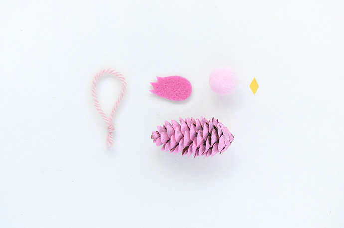 Cut and tie a loop of pink yarn and set aside. Cut a small felt wing and a mini diamond out of yellow paper.