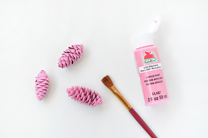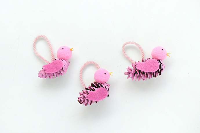 Hot glue the wings, heads, and yarn loops onto the pink pinecones.
