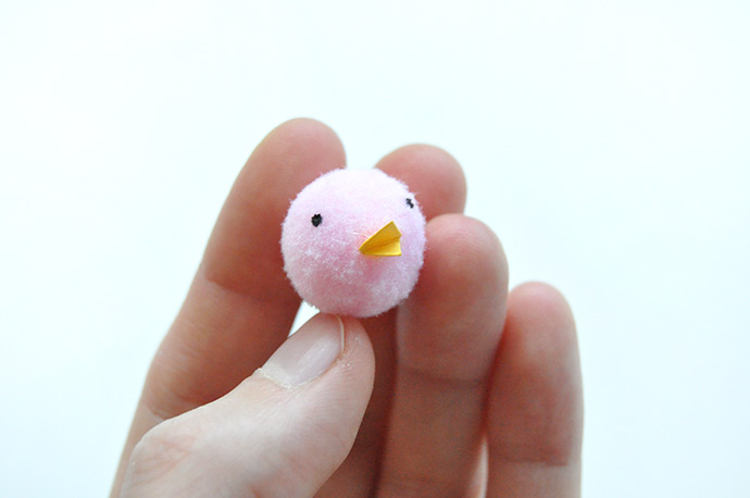 Fold the yellow diamond in half and hot glue onto the pink pom pom to form a beak. Use a tiny paintbrush to paint on eyes.