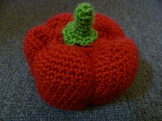 Slip stitch, fasten off, leaving a long tail for sewing. Stuff the stem and sew it to the top of the capsicum.