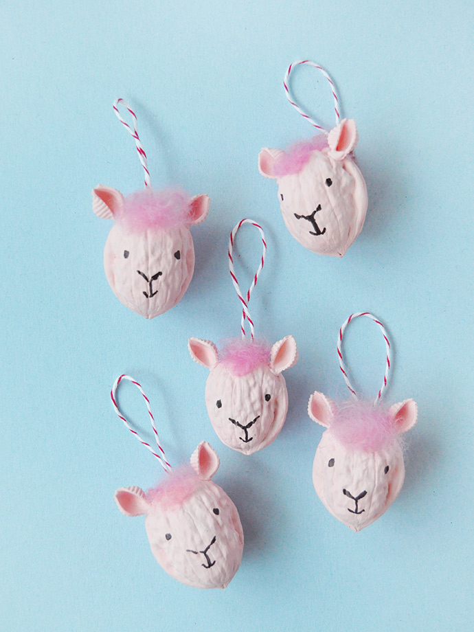 For the llama face, start with a walnut and paint it pink. Glue two mini pasta shells on top to be the ears and give them a coat of pink paint too. Use a black marker to draw on the llama’s face. Take a small tuft of wool roving and shape into a small pile, gluing it on top of the llama’s head. Make a loop of string and glue that on top.