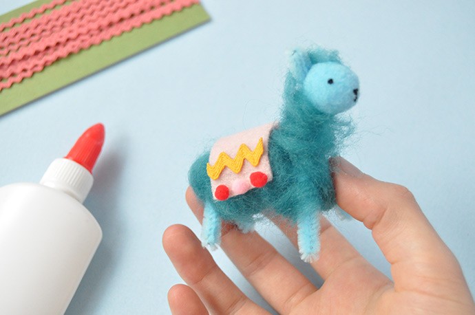 Add a felt blanket on top (glued in place) and decorate with trim and mini pom poms. For the llama’s face, use a toothpick to apply the paint to look like eyes, a nose, and mouth.