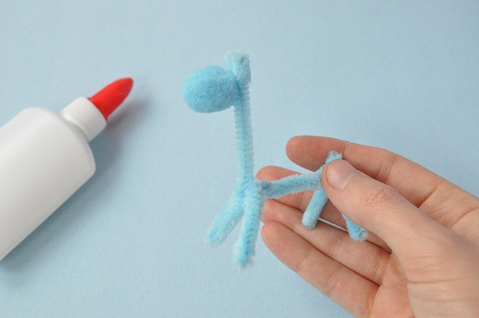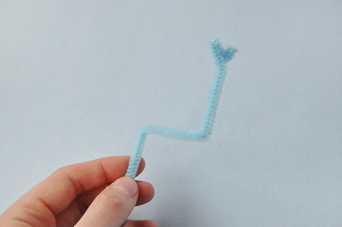 Continue bending this same pipe cleaner – at the end of the body you just made, fold the pipe cleaner down and back up to form a leg, bend a little tail sticking up, and then go back down and fold up again to form the second leg. You should have some excess pipe cleaner, so twist that around the body to strengthen it.