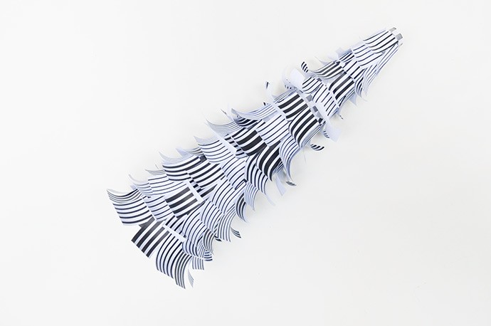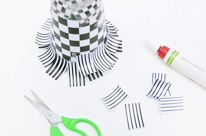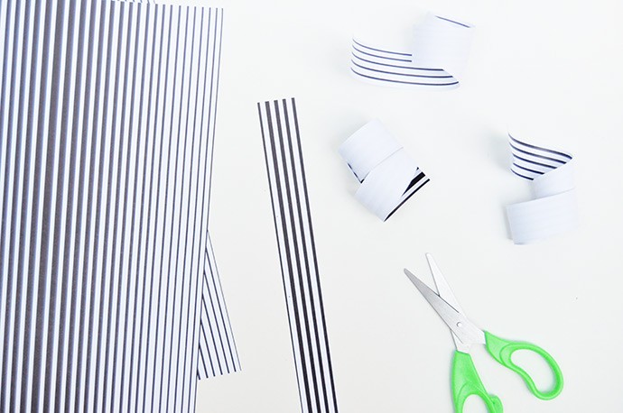 Grab a few more pages from the black and white paper pad – we used striped sheets for this step, but you can pick whichever you like. Cut paper strips about 3/4″ wide and then use your scissors to gently curl the paper as shown above. Then cut the curled strips into rectangles about 1″ to 1 1/2″ long.