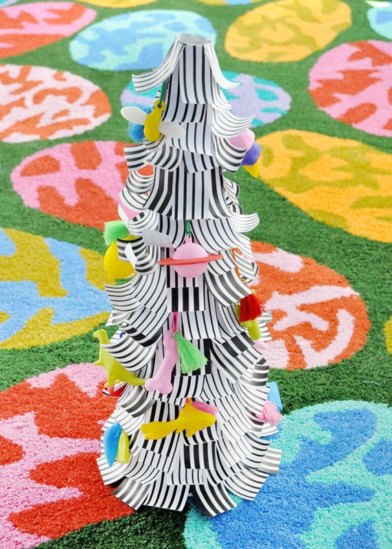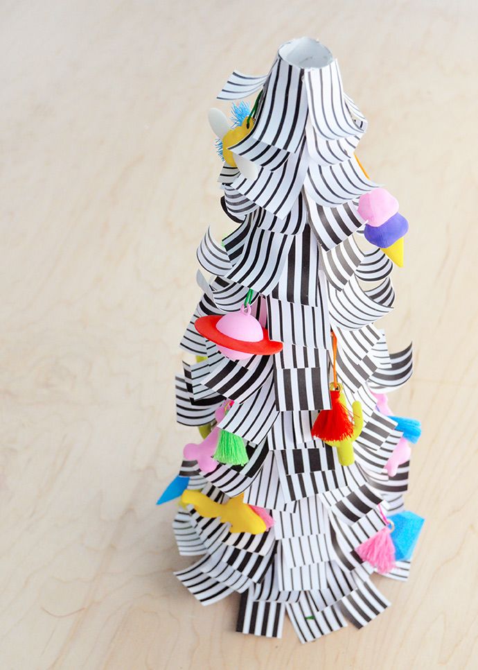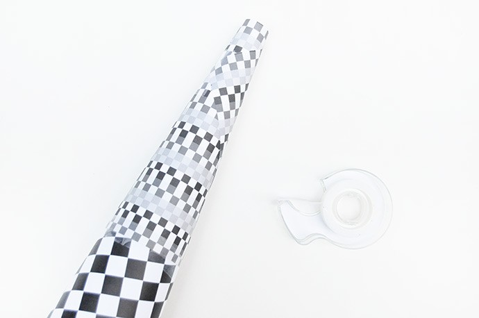 Roll a piece of paper from the Black and White pad into a cone – it doesn’t matter which pattern you pick for this because it’ll be mostly covered later. We used a miniature foam cone as the base for our tree and wrapped 2 pieces of paper around using double-sided tape or glue to attach it in place. If you don’t have a foam cone on hand though, you should be able to simply roll the paper into a cone, tape/glue to secure, and trim the bottom edge so that the cone sits nicely on your table.