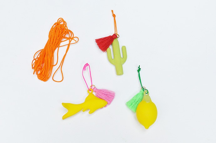 Once the charms are dry, tie a loop on top and add any tassels or additional beads as desired. Your charms are ready to hang! If like us, you have a foam cone under your tree, you can use sewing pins to attach the ornaments onto the tree – this way, you can easily remove them for storage, or if your kids want to use them for something else later. If your tree doesn’t have a foam cone inside, use tape or glue to attach the strings onto the tree.