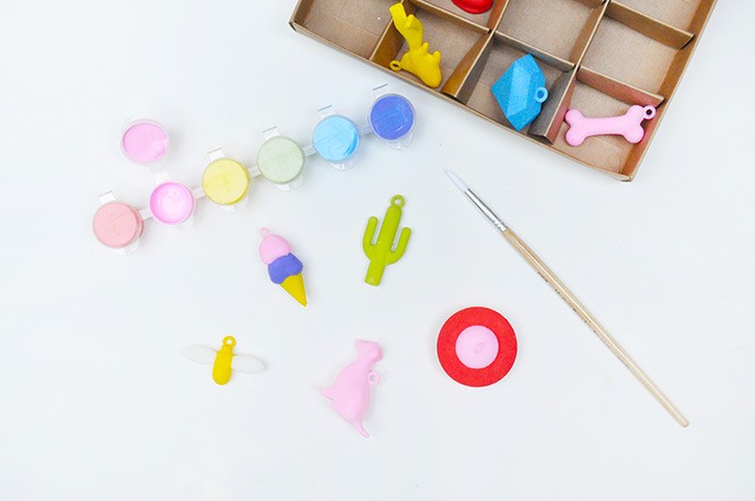 Now the fun part: painting decorations! We used the charms from Kid Made Modern’s new Charm Chest because they are the absolute perfect size for our mini tree. Paint the charms with the paint included in the set and let dry.