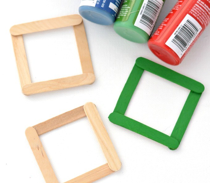 1. To get started, we glued four mini craft sticks together to form a box. We used a glue gun to glue our boxes. This step could be prepped ahead of time. You could also use regular sized popsicle sticks to create larger Christmas gift ornaments.