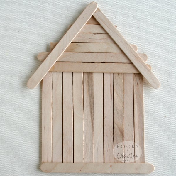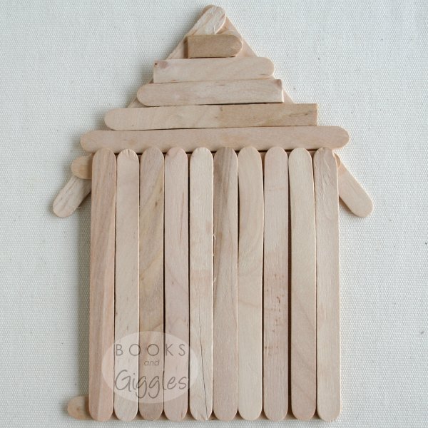 1. Lay out the popsicle sticks as shown below. For the roof, I discovered that I could cut popsicle sticks with cheap regular adult scissors. Pieces may go flying, so be careful.