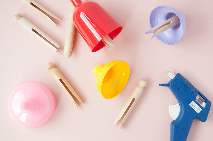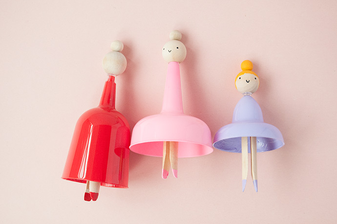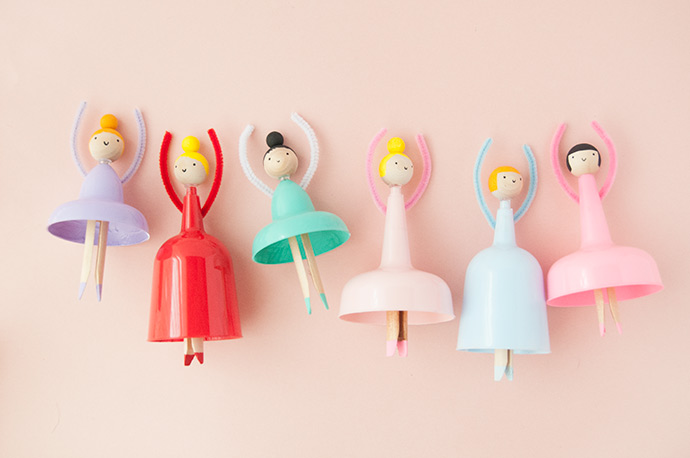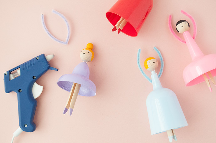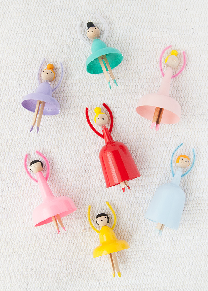To add on the dancers’ legs, apply a blob of hot glue onto the top of a wooden clothes peg and press into the inside of the painted glass, holding in place until the glue has dried and is secure. Once attached, paint the bottoms of the clothes pegs with matching paint to look like dancing shoes.