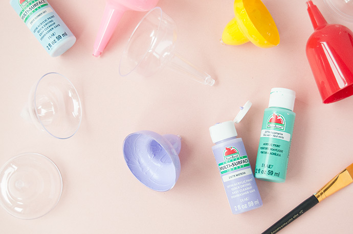 Start by laying out your plastic party cups on your work surface. If you have any leftovers from a previous party, this is a great way to use those up! Most dollar stores will have a few shapes for you to choose from: the margarita glasses give a more ballerina shape, the wine glasses look more gown-like, while the champagne coupes make a sort-of dropped waist look. For this craft, you only need the tops of the glasses, so set the detachable bottoms aside for another craft, or recycle. Apply a coat of paint onto the inside of each glass, doing a second coat if necessary so that you have a nice even coat. Let dry completely, ideally overnight.
