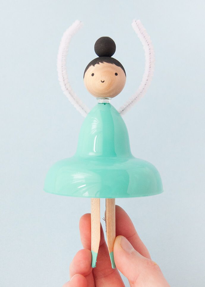Time to give these dancers some smiling faces! First glue a wooden bead onto the stem of the party cup, along with a smaller wooden bead on top, if desired, to be a bun. Use a fine paintbrush and black paint to apply a simple face. Use another brush and whatever color you like to paint on the hair. Let dry. You can also choose to leave off the bun and give the dancer a bob-style haircut instead.