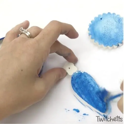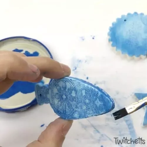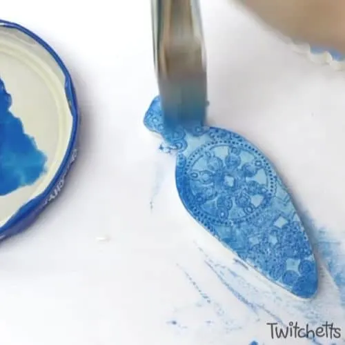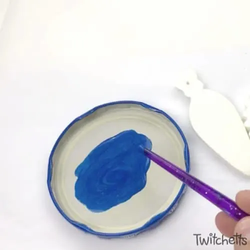 Once dry pick a pretty color to paint your ornaments. Add it to your palate with a bit of water. You want the paint to be thin.