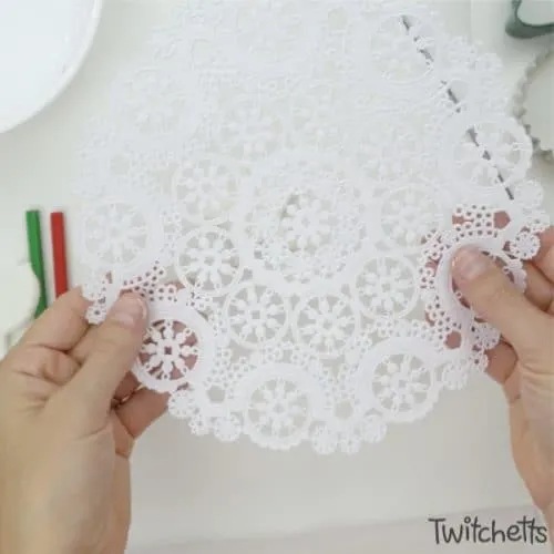 Add a little bit of water so your surface is moldable and lay on your doily.