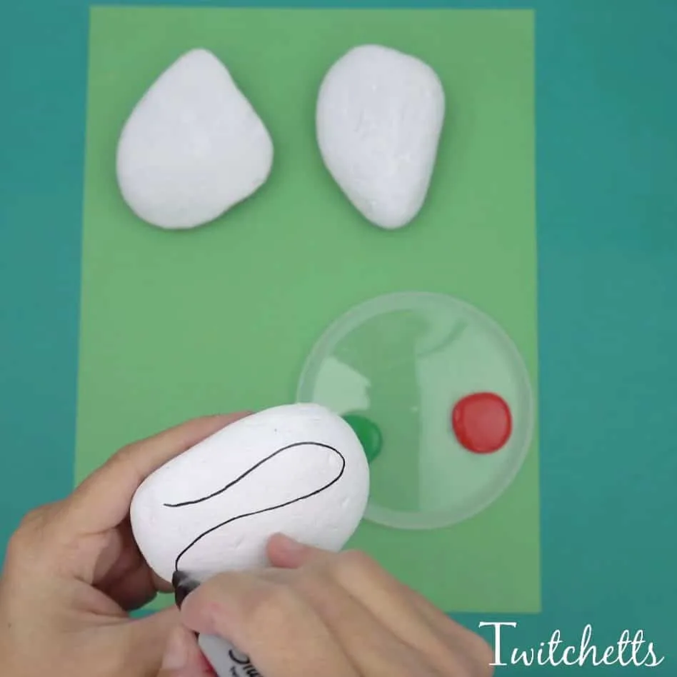 Always make sure to wash and dry your rocks. For these Christmas rocks, we started with a base coat of white. This way the lights pop a bit more on the rock. Once the rocks are dry, use the Sharpie to create a string for the lights. They can go any direction you like!