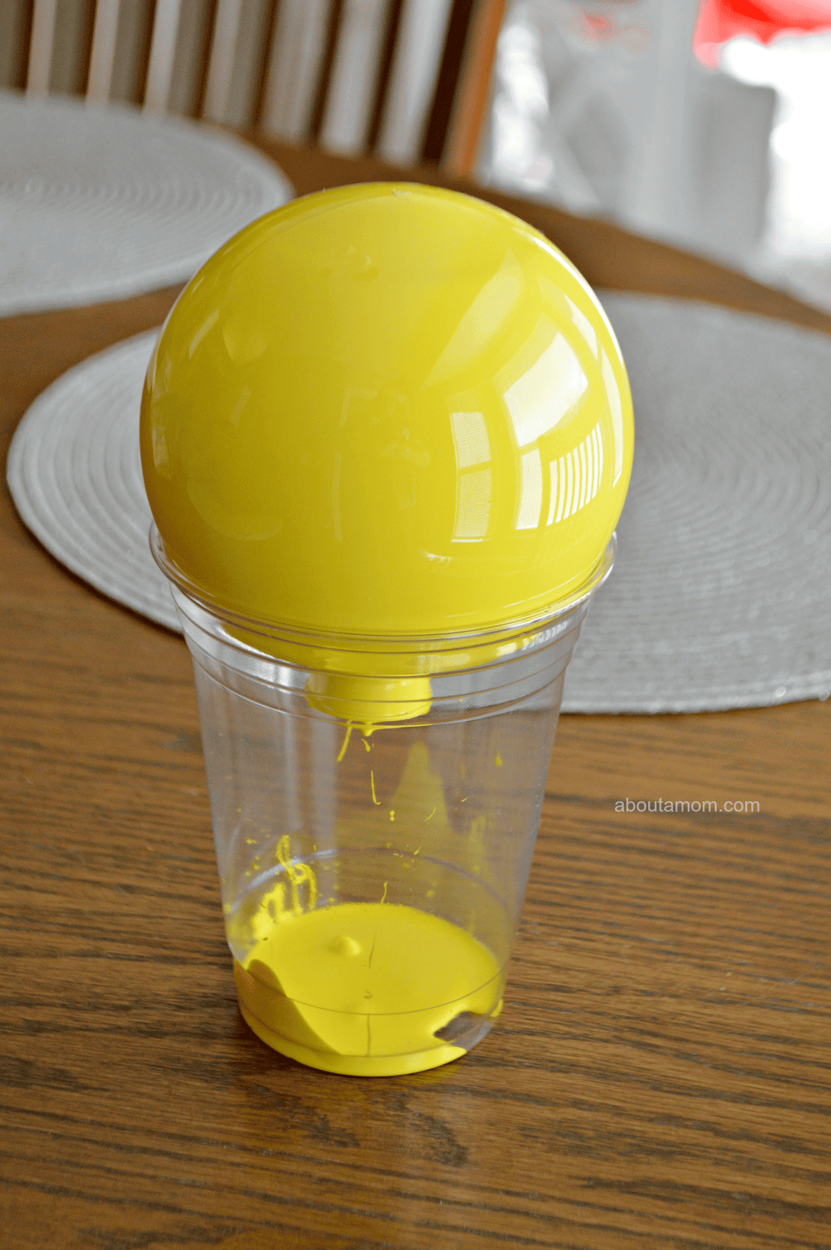 Remove cap from ornament, drizzle a couple teaspoons of yellow paint inside ornament and shake it vigorously, covering the opening with a napkin to keep it in. Add more paint if needed to completely coat the inside.