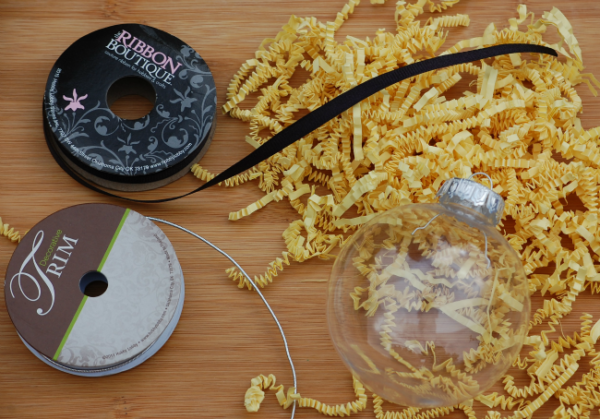 2. Glue black ribbon slightly above the center of the ornament wrapping it around the ornament.