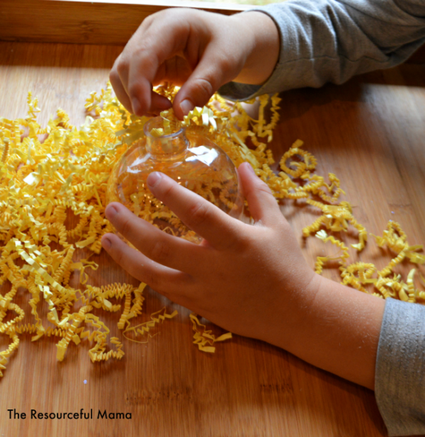 1. Remove the top of the plastic ornament and fill with yellow decorative shed. Once full put top back on the oranment.