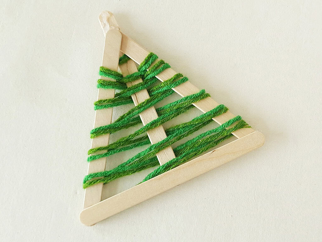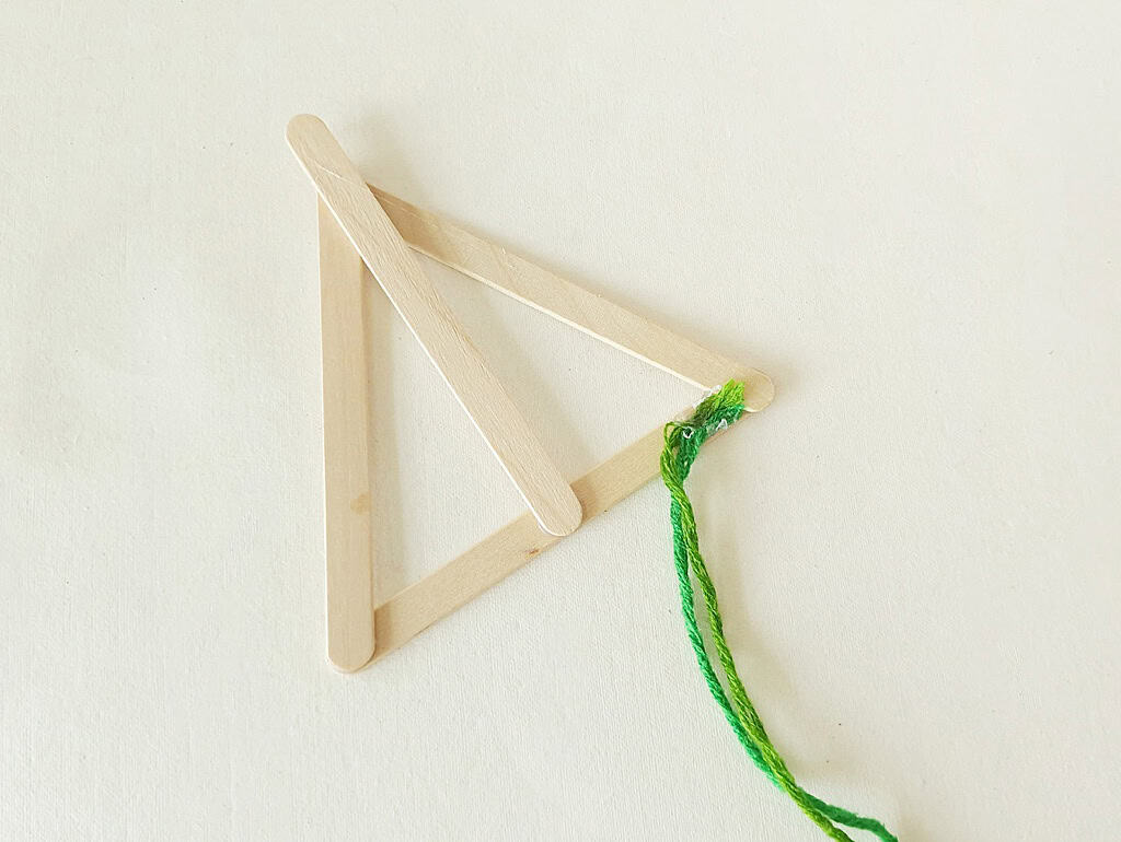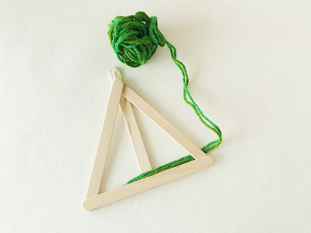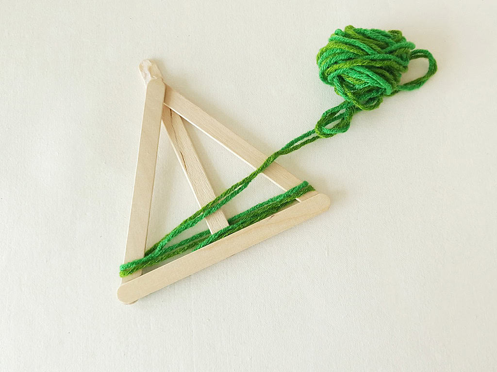 Turn the tree over, so the yarn is on the backside. Bring the yarn up through the middle and over the center popsicle stick, then back behind the other side of the triangle.