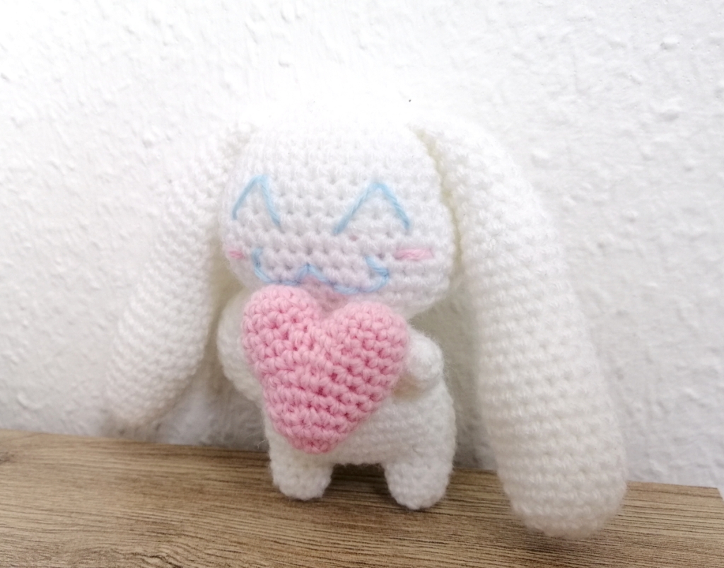 – White yarn for cinnamoroll itself, pink yarn for the heart and light blue yarn for the facial features