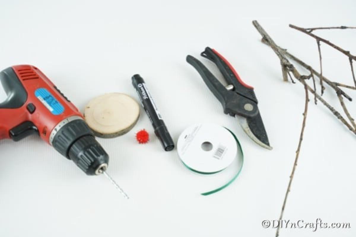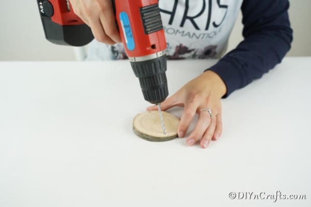 If you are going to add a hole to the wood slice, you will begin by using your drill to make a small hole near the edge of the slice. String a ribbon or yarn through the hole and tie it for hanging later.