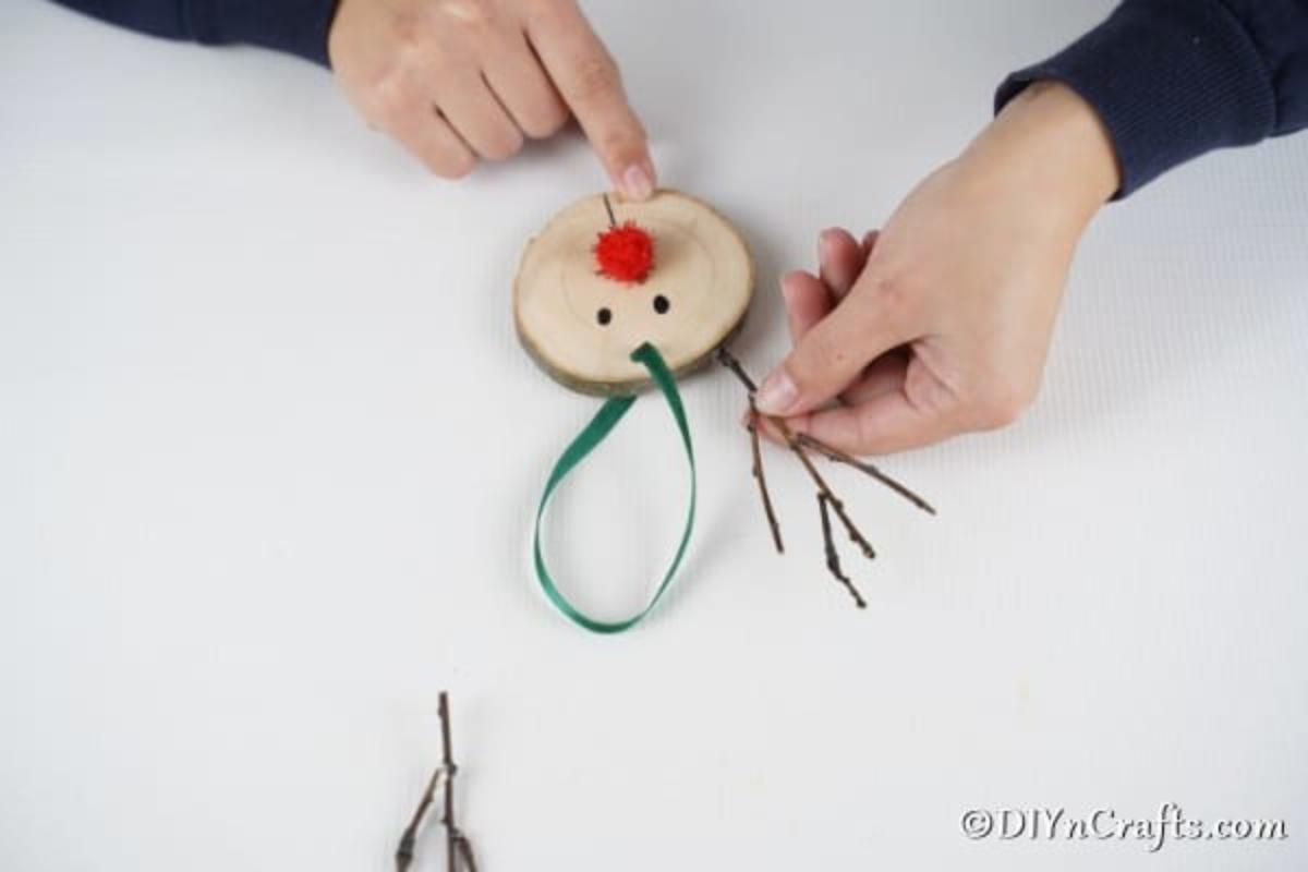 Next, take some of the twigs, break them into a small piece, and glue them to the back or top of the slice near the hole you made earlier.