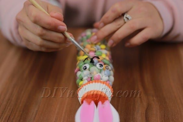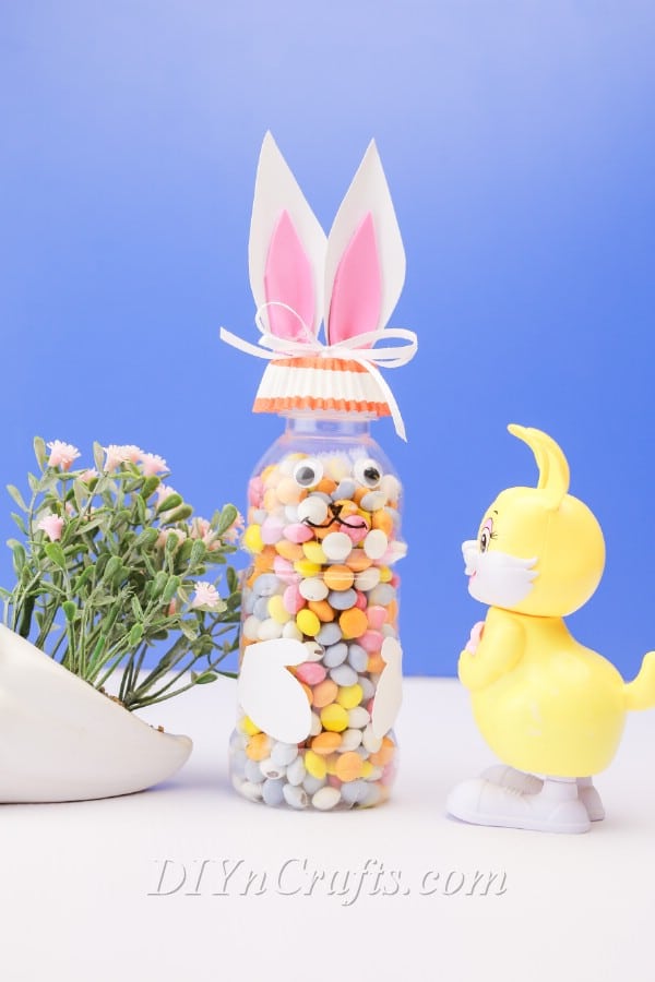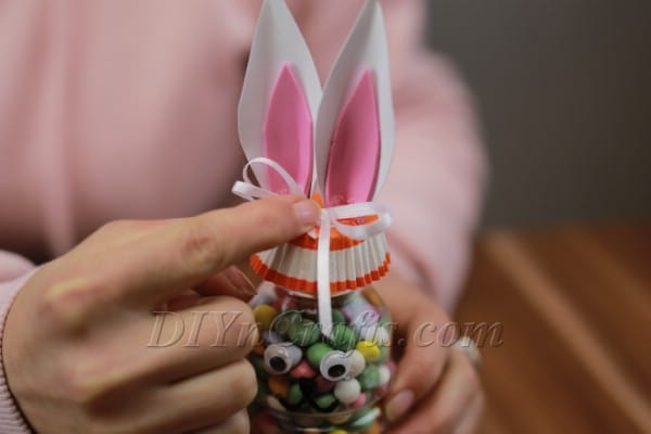 You can now carefully uncap the bottle (see the notes section below) and pour in whatever type of candy you want. Your candy bottle bunny is now ready to be given as a gift!